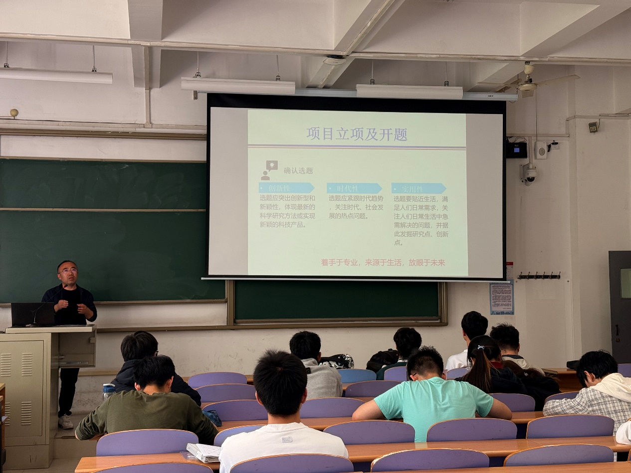 王明江老师以“老员工创新创业训练计划项目流程介绍”为题为员工进行专题讲解。他围绕员工们关心的“大创整体流程及时间节点”“如何立项、申报并开展大创项目”“如何应对大创中期检查和结题验收”“如何做好大创项目”等几个方面的问题进行详细讲解,为想要开展大创项目的低年级同学指引了方向。