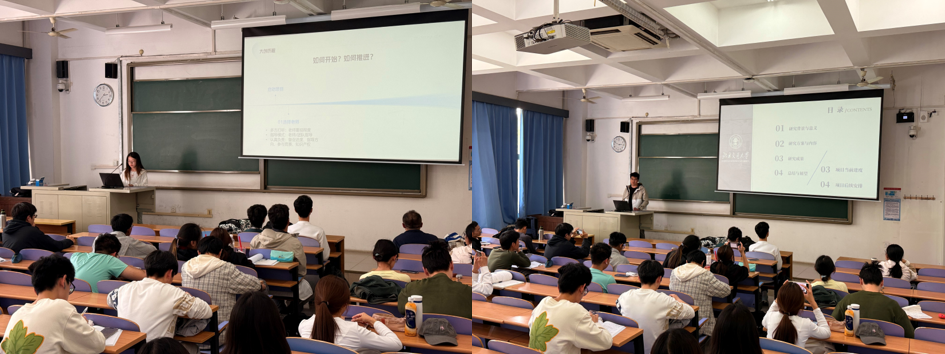 刘怡然从自身的大创经历出发,向大家分享大创答辩PPT的制作要点以及答辩技巧。范昊翔通过讲述自己的项目经历,向大家分享如何进行团队分工以及取得优秀成果。