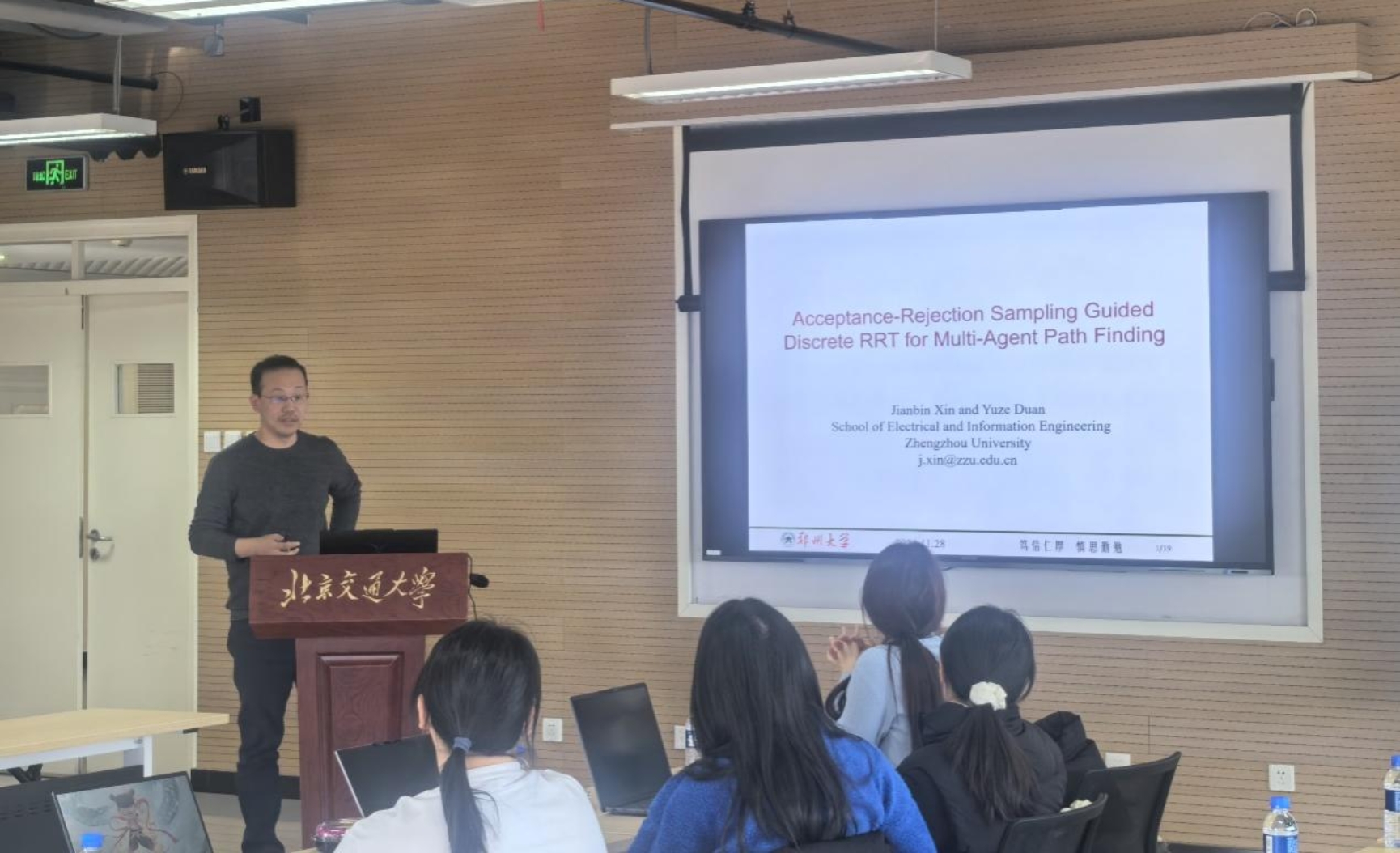 辛健斌以“Acceptance-Rejection Sampling Guided Discrete RRT for Multi-Agent Path Finding”为主题,分享了一种新的由接受-拒绝采样引导的离散快速探索随机树(RRT)算法,并详细阐述了算法的核心思想与技术细节。报告中,辛教授还分享了该算法在工业模拟环境和实际测试中的验证结果,证明了所提出算法在多智能体路径规划问题中的有效性和可靠性。